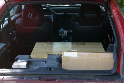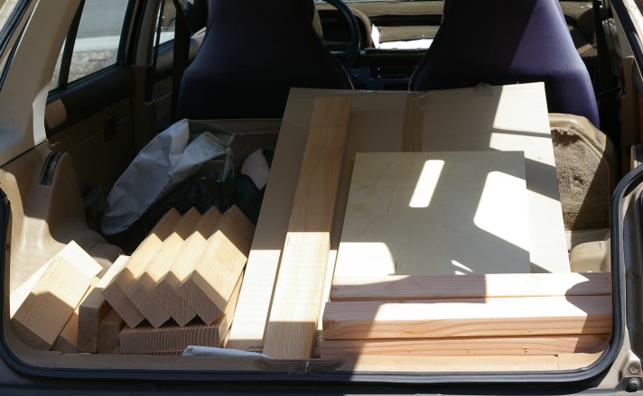 It was to be a day of driving around with a lot of big heavy stuff piled in old Hondas; for the next stage, we’d be using The Karen’s Civic Wagon (nostalgia for me, since my mom had one just like it.). I had decided that I was going to save a lot of time on the workbench top by purchasing a “Numerär” countertop from Ikea. This thing is basically a 1.5″ thick block top available in solid beech that weighs 70lbs. After my days of living in Europe, I’d never thought that I’d ever buy anything from Ikea again, but my only real regret about this is that Ikea didn’t bestow the countertop with the “Skänka” name, because of the obvious yet still hilarious joke.