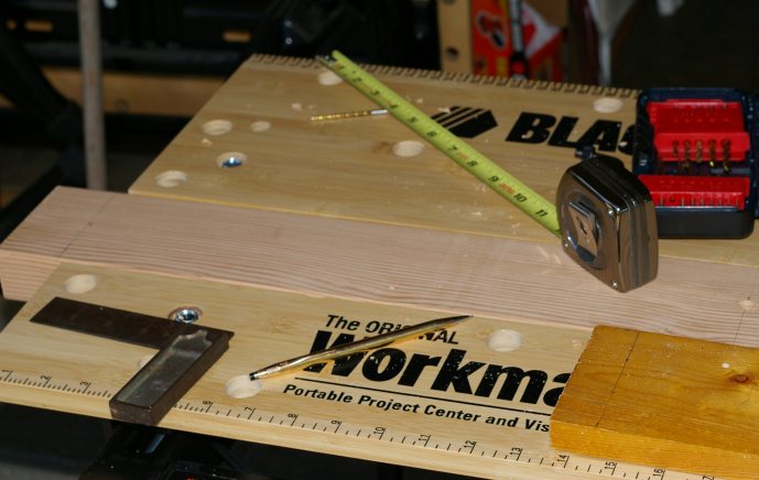 When I felt a little up to doing a little something, I pulled the Workmate® out of the CRX and set up a few jigs. Then I clamped some boards in the vise and started some drilling on the legs: