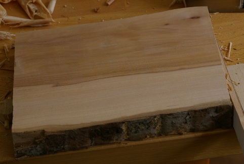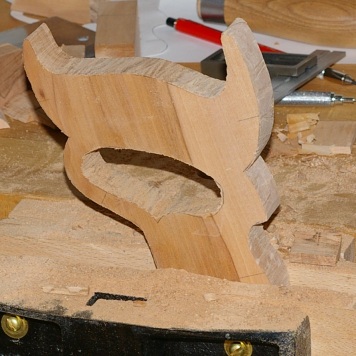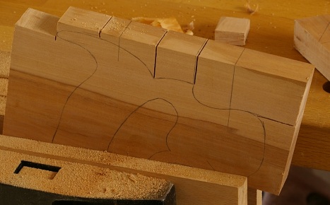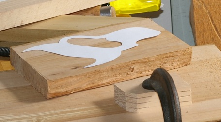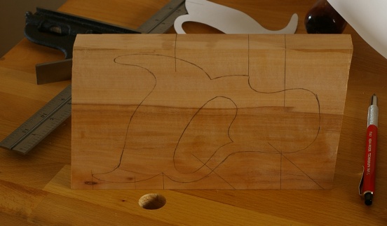 It was also unusual because I did not mill the board four-square. Rather, I made the faces trapezoidal, just taking care to get the edges square to the faces, and that the thing was of course of uniform thickness. Once that was done, it was easy to transfer the pattern to the wood.