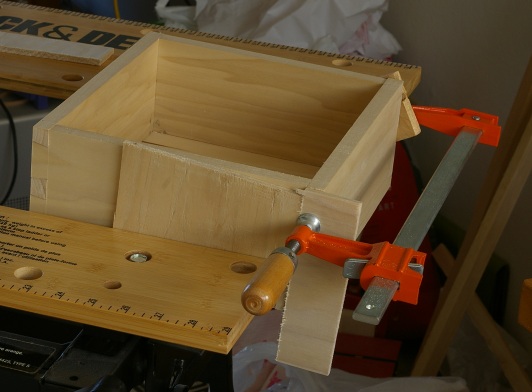 At this stage, I realized that I am clamp-challenged or just silly, because I wasn’t able to jam the tails in far enough to get rid of some very small gaps on that side, even though I knew it was possible to do that. When I glued the front on, I used my Workmate and the one bar clamp I have to get rid of that problem on the other side, at least for the most part: