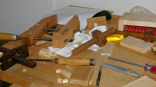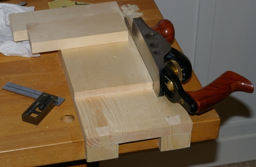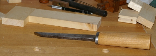 A couple of oil/varnish blend applications later, along with the requisite sharpening, it was ready to use. Here it is with its first test mortise-and-tenon joint (upper left, not that stuff to the right):