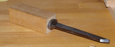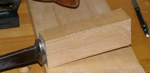 I marked out the angles on the mortise chisel by “feel,” just by sort of looking at all of the pictures I’ve seen and guessing. With two sides cut away, it looked like this:
