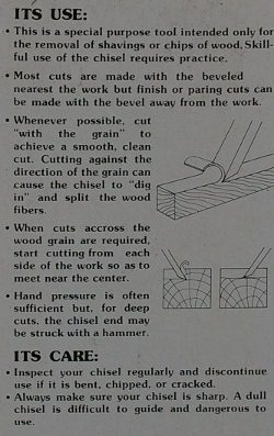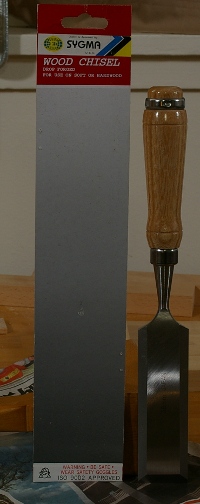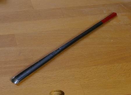 Although it looks cheap, this gouge was not particularly cheap. The red at the end means that it’s made with “quality steel,” and I think the cost was about $8. I’ve tried it out and it works fine, but I think I’d prefer to make an appropriate mallet before doing too much with it.