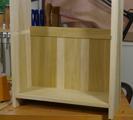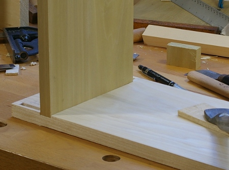 Now that the bookshelf prototype is glued up and ready for varnishing, I’m able to move on to my next project, which will be a short stool, essentially a single-step stool similar in spirit to the one that my great-great grandfather made. It won’t resemble his in size, wood type, or joinery; it will be adult-size and not use nails. Here is the general plan: