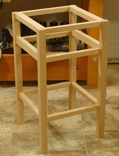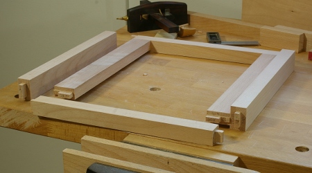 The nightstand project requires 24 mortise-and-tenon joints for the external frame, four for the drawer runner supports, and four more for the decoration on the front. I’ve cut all of these except the ones for the decoration. Here’s a shot of a test-fit of the external frame (without the runners):