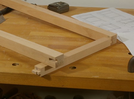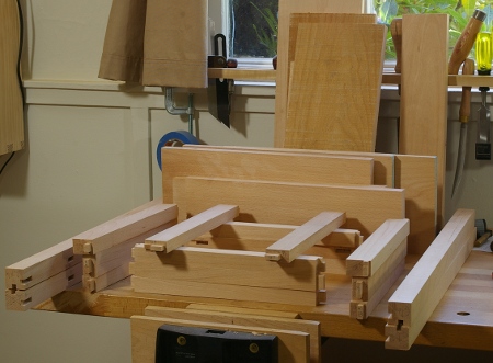 This project’s joints are a motley bunch. I’m using different offsets at different locations to try to maximize contact based on constraints of panel and corner placement. Some have haunches to improve alignment. Here’s a shot of the middle frame layer, the one that the drawers will rest upon, showing the drawer support runners that I just finished up today:
