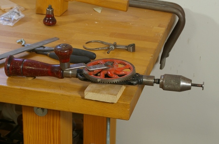 I wanted to do something a little special for this project because the handle is a more traditional style. However, I still wanted to use the furniture connectors that I’d used for my other saws because, well, I like them. Some time ago, and somewhere in the dark corners of my mind, I began to think of a plan to spice up those things. And out of whatever means, I came up with a ridiculous scheme to make sort of a pseudo-lathe out of an eggbeater drill.