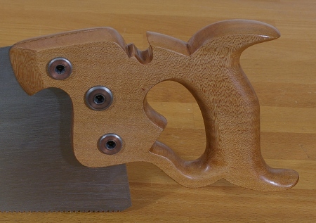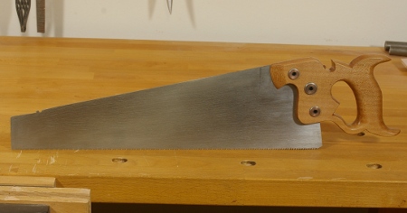 I sprayed a protective coat of lacquer on the hardware and then set out to finish the sawplate. For whatever reason, it took me longer to sharpen this one because it was difficult to get past the remnants of the original teeth. Maybe I wasn’t paying attention. Then I sized up the heel of the plate, drilled the holes for the hardware (with that same eggbeater), and put it together. It was finished:
