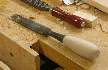Everyone seems to make a handle for a handle-less socket chisel that somehow escaped the wrath of mushrooming by way of hammer. In my case, I had a 1.25″ Stanley 720 sitting around asking for some attention. I thought, hey, well, if I ever have a chance to sit down with a lathe, maybe I’ll make one.