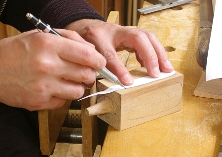After a few iterations, the chisel fit, and it was off to shaping. I didn’t know what pattern to use, but I like the general contour of those yellow-handled Lee Valley chisels, so I traced that to a piece of paper, then traced that pattern onto each face: