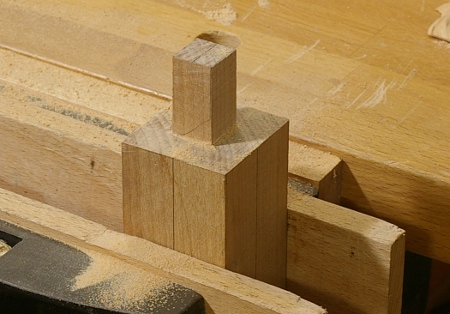 So I decided that is what I would do, and I finally got around to it. I dug out the handy block of yellow birch that I used for my pigsticker handle, cut off a piece, marked lines through the center of each face, and then cut what sort of looks like a square tenon for the cone where the socket fits: