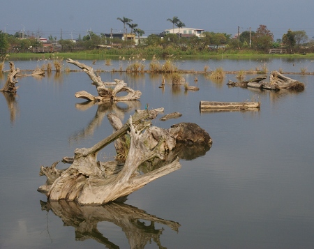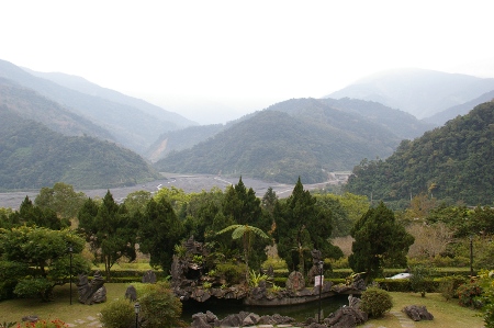 The area is called “Divine Trees.” It’s not wholly virgin old-growth forest; it has been logged, but many trees here were saved. Though it’s not far from Yilan or Luodong (maybe about 25 miles as the crow flies), getting there gives you plenty to think about. You start out in the valley (400m/1312ft). Here is the view from the forest recreation area there, next to the hotel where we stayed: