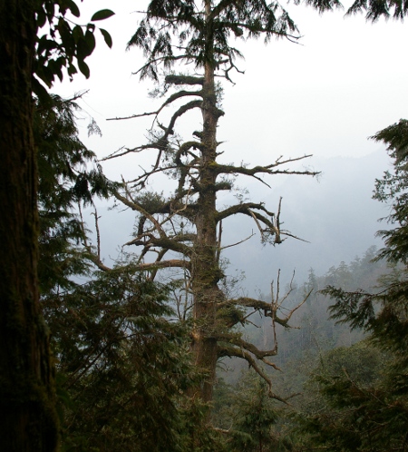 During the trip, if you’re not battling motion sickness, you see the forest changing around you. In the valley, the forest is far more of a jungle, with broadleaved trees, fern-like plants, and vines all around (monkeys in the warmer months, too). But as you ascend, you start to see Taiwania (Taiwania cryptomerioides, an important timber species, but not the subject here). If it’s not a clear day, you reach the cloud cover and it becomes foggy. You start to see trees with the scaled foliage sprays that you see in so many genera/species in the Cupressaceae family. It’s a sign that you’re getting closer. Then you see hulks of grey, dead trees towering out of the forest on the mountainside: