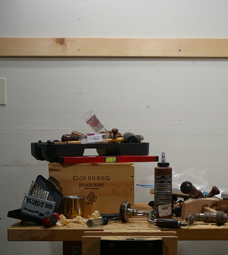 I was thrilled with this development, because my goal for the weekend was in fact to get the saw till up on the wall. That thing is my single-most important tool container. After taking this photo, I made a few more tool holders and put them up.