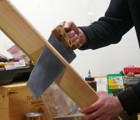 The first cleat turned out to be pretty painful to make for a couple of reasons. First, I hadn’t secured my benchtop onto its base yet, so the top insisted on sliding all over the place. Second, because I managed to tweak my wrist a little while snowboarding a week before (as I said, you gotta do what you gotta do), sawing was a little painful, as was shoving around those metal planes. The biggest problem was that I just didn’t have full wrist strength.