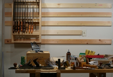 I even found my drawknife, so I put it up on a cleat to celebrate. Next, I’ll put the chisels up, provided that I can find them.