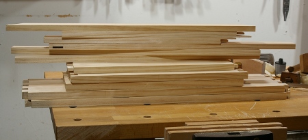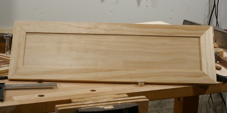 That seemed okay, so I made the other door, then shifted my attention to cutting the panels for the cabinet rear. They require edge-gluing, so I decided that it was time for a glue-up party for the panels and one of the doors: