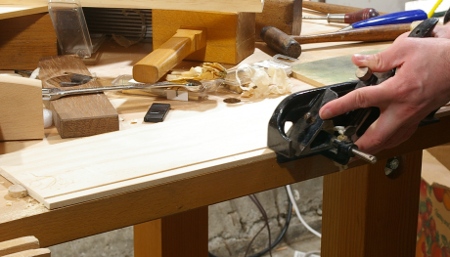 Having fooled around long enough flattening my workbench, I returned to the tool cabinet project. I was close to being done with all of the components, so I decided to get the doors finished. The doors will consist of two frames, each with a long panel inside, and the first order of business was to make the grooves to house the panel. I started with the easy parts–the pieces where the groove goes all the way though, because I was eager to try out the Stanley #45 I posted about a while back.