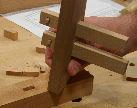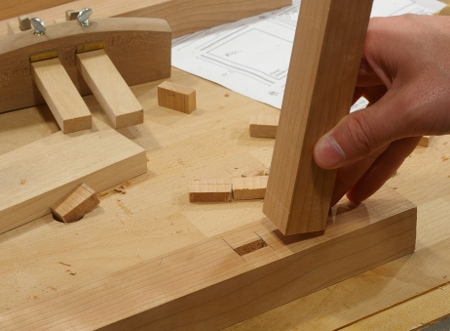 Chop your mortise. The following photo shows a completed mortise, and the tenon member roughly at the depth it will eventually go: