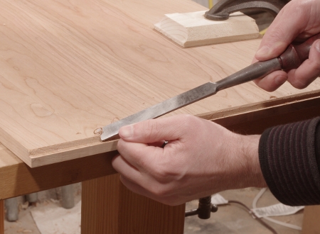 Later on, I switched to a narrow rabbet plane; for this small amount, it worked a bit faster than the chisel.