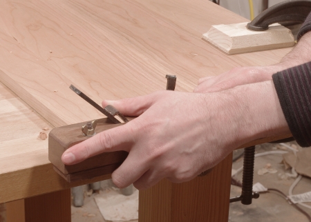 The second nightstand project is lumbering and stuttering forward, this time with the tops. I glued up the tops a few weeks ago, smoothed them off, and cut the left sides even and square. I’d been debating what to do about the edges for a while, but then I got the order that they ought not to be “so plain.” Emboldened by a somewhat recent episode of The Woodwright’s Shop with St. Roy hosting Bill Anderson, I thought that perhaps I’d be able to do a simple single ellipsoidal curve.