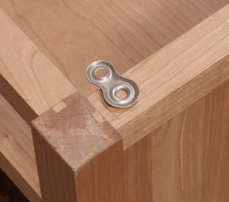 I’ve been varnishing for maybe a month. When I’d gotten enough onto the cabinets, I took care of two remaining steps before the final rubout. The first was how to attach the tops. I decided to use figure 8 connectors because they seemed like a pretty neat approach. Placing them into the cabinets was relatively easy. First, I marked out a box (with no particular offset):