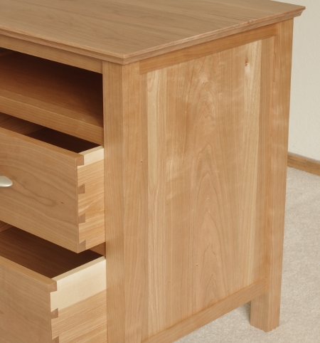 I need to make a note about what’s going on with the woods here. In the side panel, there is a roughly 6″ wide slice of flatsawn cherry stock in the center to give it the central cathedral figure; each side panel has this. On each side of that, there are narrower strips of birch meant to provide contrast as stripes. Then, the outermost strips from the center of the panels are again cherry.