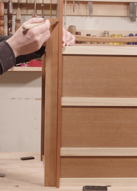 It’s a little difficult to see the scrap here because it’s also a piece of cherry, but it’s the thin thing sitting up next to the foreground leg. After making the mark, I scribed around from that mark and sawed off the ends. It worked fine.