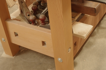 That change removed any doubts I had about this design. The Schwarz slightly poo-poos knockdown construction, complaining that you have to tighten up the bolts from time to time. I have not run into this as an actual problem. It’s just not that hard of a thing to do, and it’s not like it happens all of the time, either, especially when your wood is reasonably dry and stable (think douglas-fir), and you have an enormous joint mating area. I may have done it twice during the whole time I’ve used my bench.