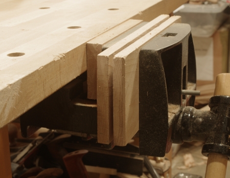 Yes, thicker would have been better. Being beech, the top was fine for taking a pounding as long as you were working near a leg (and that’s what you’re supposed to do anyway). However, a thickness of not even two inches has two weaknesses. The first is that it’s not as heavy as it could be. That’s not such a big deal, but the second issue is that it was difficult to mount the front vise. The model I have really wants something thick, and if you don’t have that, you have to improvise. I did so in an odd way; I’ll talk about that in a bit. But let’s not forget about the lack of dog holes in the front–I couldn’t put any in at that thickness.