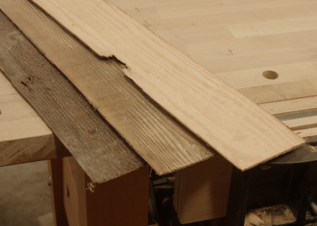 The boardstimbers had a layer of cruft on the faces, consisting of oxidization, dirt, and who-knows-what. After cutting roughly to length, I sawed off the crud. That process looked like this: