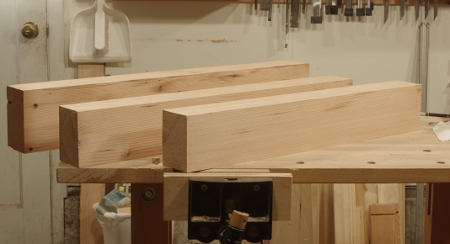 I got the first pieces of wood for this project late last year. A fellow BAG has a pretty serious quantity of reclaimed douglas-fir sitting around and was gracious enough to offer it my way (thanks Bill!). This is big stuff–basically 4x12s and 4x14s supposedly taken from a warehouse. Reclaimed douglas-fir has many advantages, but two of the biggest are that it’s quite hard (yet easy to plane), and it’s really, really stable.