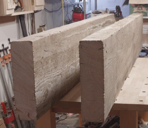 The difficulty: Right now, I don’t have any pieces of douglas-fir in the appropriate size. The offcuts from the big rips are really a bit too knotty for my tastes (big knots in long-seasoned douglas-fir are essentially indestructible). I thought of getting one more timber, but then I had this other idea. I happen to have a piece of well-seasoned 8/4 beech that’s just the right length and width. Would it make sense to use that in the front? It doesn’t dent as easily as douglas-fir (even the excessively old stuff that I have).