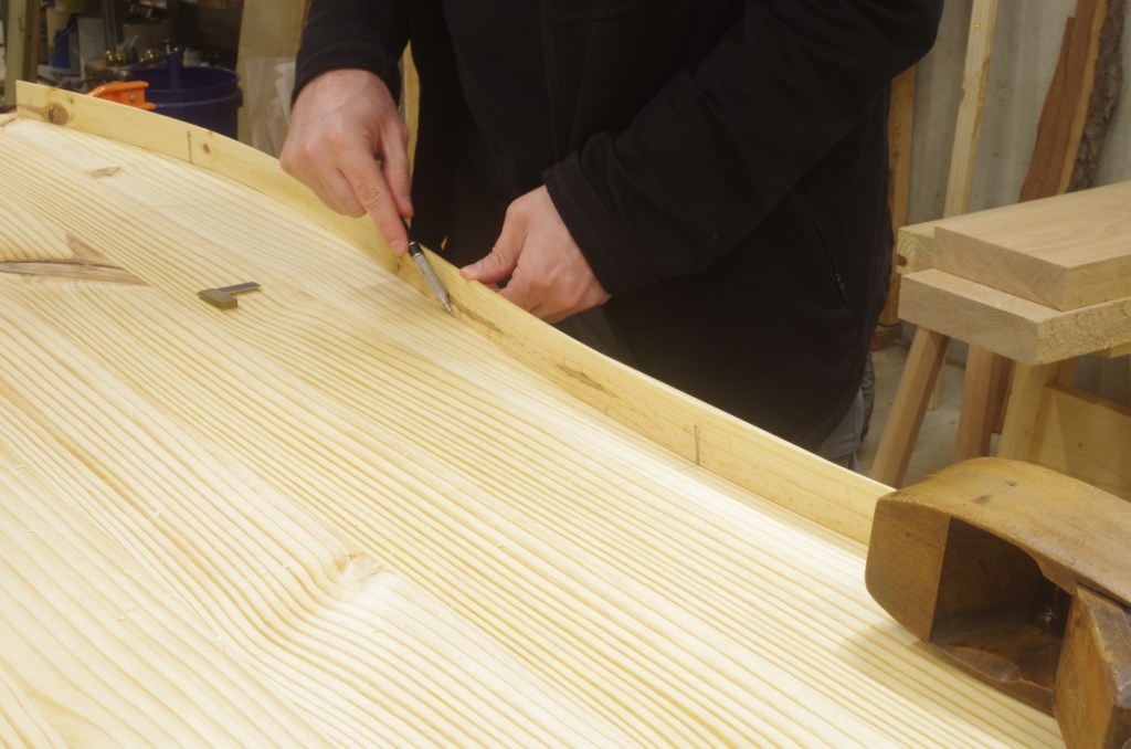 Then there was a curve to lay out on the front. I guess I’ve been watching too much “Tally Ho,” because I tried to imitate Leo’s curve marking with a batten tacked into place: