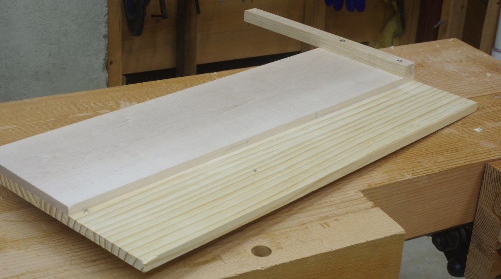 I made another shooting board, this as described in “The Woodworker” for (basically) jointing smaller work. Having no experience with that kind of board, I decided to make a quickie prototype in “hem-fir” to see what I could learn from it. I have nothing to share about this at the moment; I’m planning out improvements for the next version.