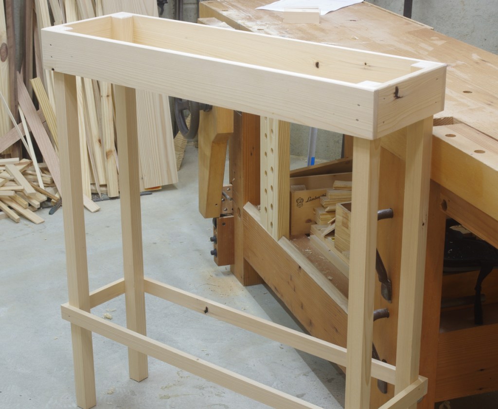 This is cheap construction wood that I had lying around (one “hem-fir” 2×8). There are several knots that I just banged out rather than wait on them to fall out–I didn’t feel like planing over them. Probably the most time-consuming part of this was just getting all the bits and pieces cut out and milled to profile.