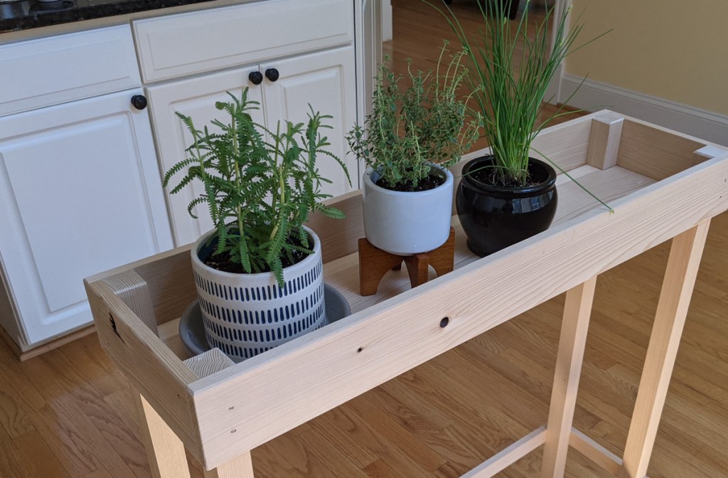 Among my various tasks for the past couple of weeks was making a stand for some pots and planters. This isn’t a raised bed meant to hold dirt by itself; it’s more of an enclosed shelf. It was not a complicated project, and it’s done: