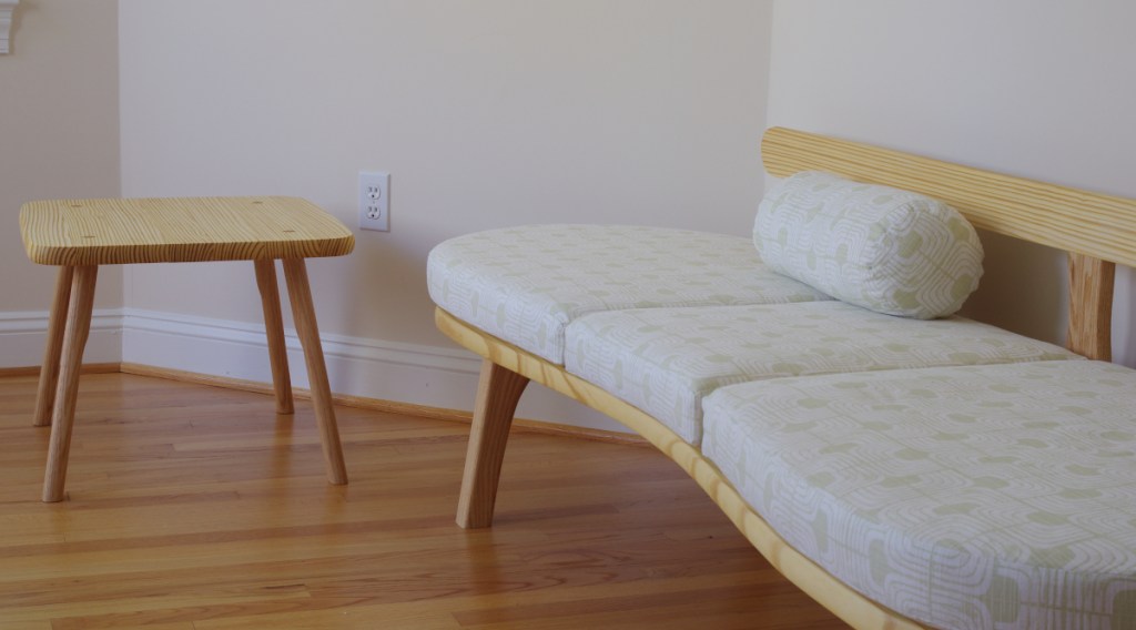 This might not be the final arrangement, but the two pieces are meant to go together. The legs and tops are meant to complement each other. The table’s top is in the profile of the daybed legs, and the table’s legs have a more oval profile, like the platform and rear support of the daybed. Both sets of legs have a sort of single-step taper.