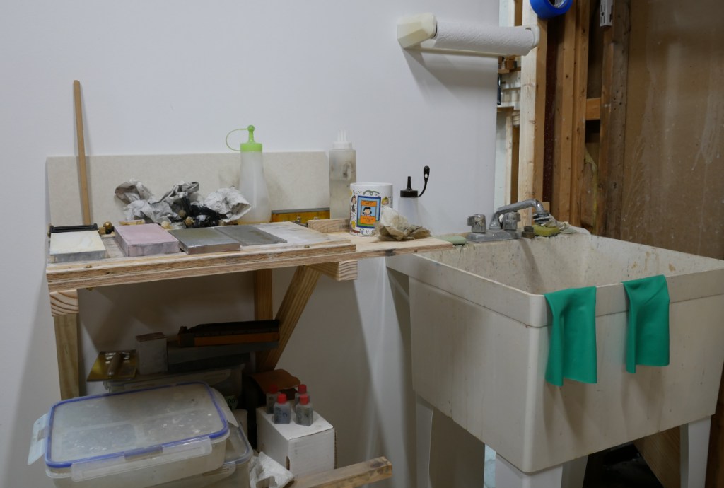 Sharpening station. The drywall allowed me to build some semi-permanent brackets for a sharpening station next to the slop sink. This low-rent project from some spare southern yellow pine and plywood cutoffs made life much easier. It is close to my work area, my stones are right there, ready to go, and it’s clear of any other junk. Just go over, sharpen a tool, and get back to work.