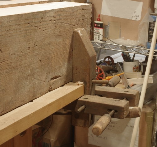 After some fretting and sulking, I reminded myself that Toshio Odate wrote about how Japanese carpenters secure stuff both big and small against a wall (or something). Looking at pages 6-7 of his Japanese Woodworking Tools book, I tried to think of how I might be able to do this with with western tools. The one really important thing, it seemed to me, was to be able to keep some clearance between the end of the timber and whatever you’re securing against.