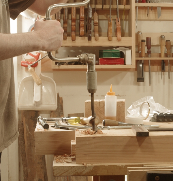 I used my 14″ sweep monster (a Millers Falls #730). For those of you who have never seen a bit this large, consider the following: The brace’s chuck was just barely able to hold the bit, and only because they tapered the shaft thinner near the end.