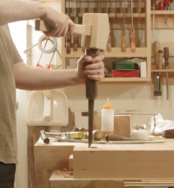Then I made one side of the hole flat for the nut and washer to register against. This was an easy job with a big “pigsticker” mortise chisel: