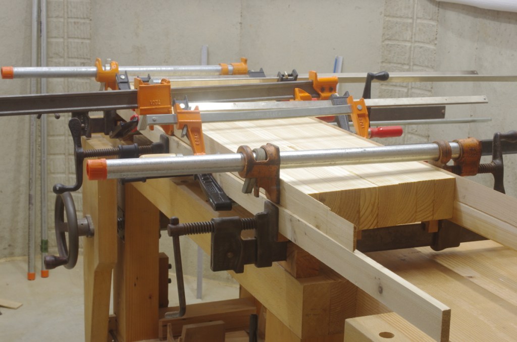 The past few weeks have primarily involved milling, milling, and more milling. Oh, right, there was also a trip to Pennsylvania. But after all of that excitement, I was able to glue the top. I used every medium- and heavy-duty clamp that I had for it: